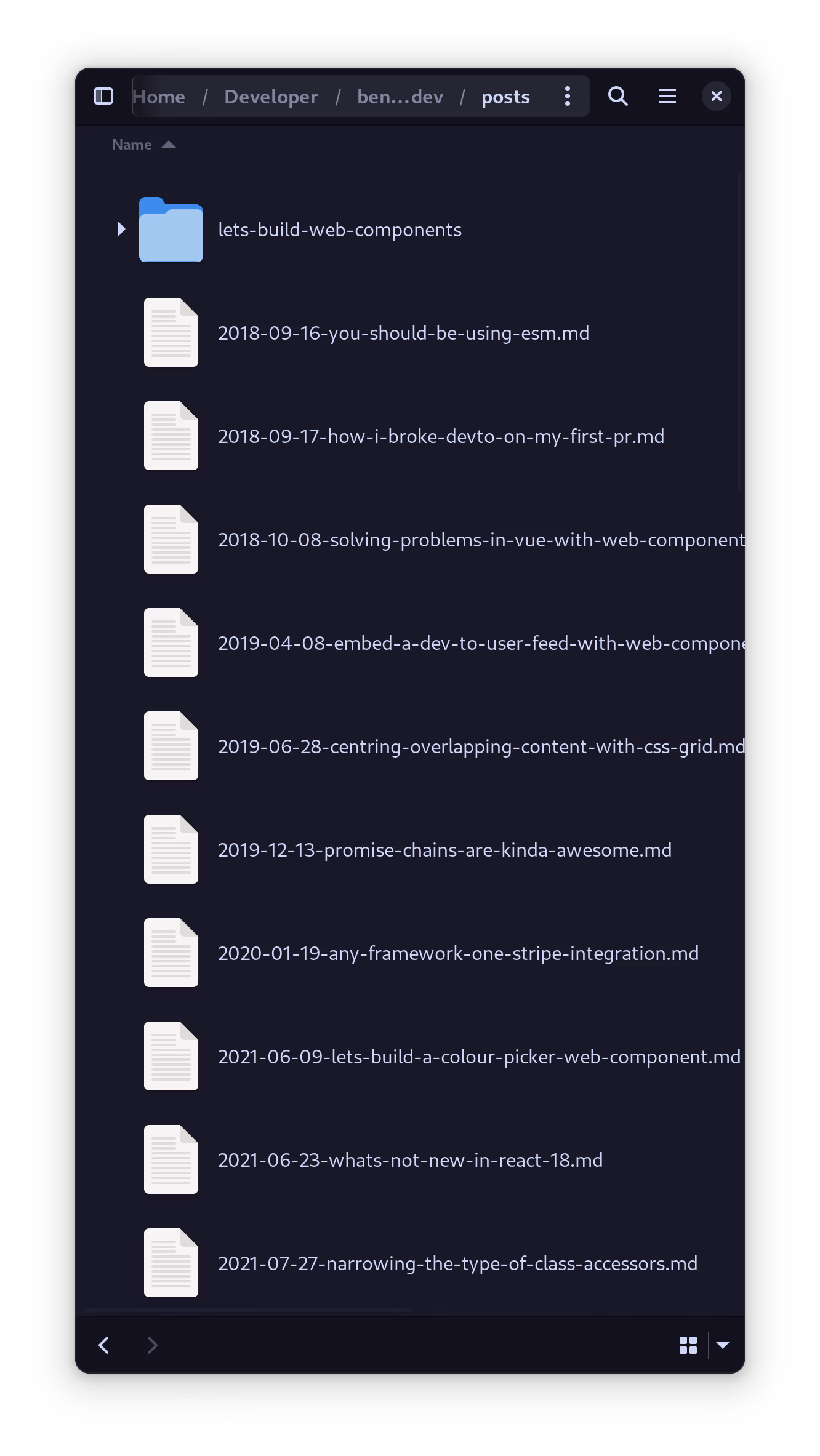 posts ├── 2022-01-07-lets-write-a-redux-controller-for-web-components.md ├── 2022-11-14-form-associated-custom-elements.md ├── 2022-12-12-micro-dreidle.md ├── 2022-12-25-8-days-5783.md ├── 2023-01-01-microbit-countdown.md ├── 2023-01-15-11ty-svg-sprites.md ├── 2023-01-31-cheap-netlify-11ty-rebuilds.md ├── 2023-02-18-splitjoin-nvim.md ├── 2023-02-19-microcopy-reactive-controller.md ├── 2023-03-19-microbit-spruce-up-tug-of-led.md ├── 2023-04-11-webc-impressions.md ├── 2023-04-13-11ty-wrap-emoji.md ├── 2023-04-14-eli5-web-components.md ├── 2023-04-14-sefira-isru-hag-pesah.md ├── 2023-04-23-webc-nvim.md ├── 2023-04-26-adelman.md ├── 2023-05-09-import-map-cdn.md ├── 2023-05-21-markdown-images-treesitter.md ├── 2023-07-10-debugging-gnome-extensions-dbus-run-session.md ├── 2023-07-23-webc-dsd-slot-workaround.md ├── 2023-07-28-sort-and-date-11ty-posts-by-name.md ├── index.11tydata.cjs ├── index.css ├── index.webc ├── lets-build-web-components │ ├── part-1-the-standards.md │ ├── part-2-the-polyfills.md │ ├── part-3-vanilla-components.md │ ├── part-4-polymer-library.md │ ├── part-5-litelement.md │ ├── part-6-gluon.md │ ├── part-7-hybrids.md │ └── part-8-mythbusters.md ├── posts.11tydata.cjs └── posts.yaml2 directories, 45 files